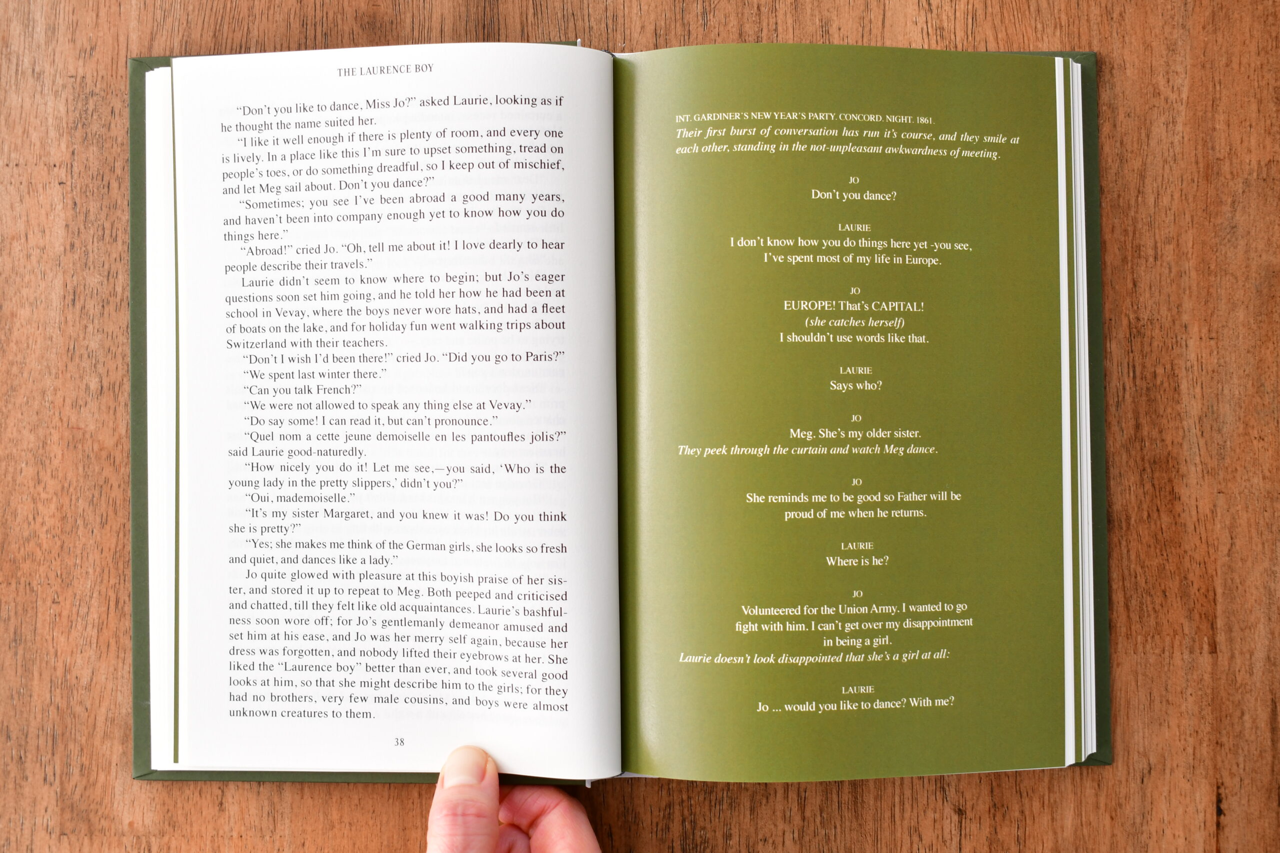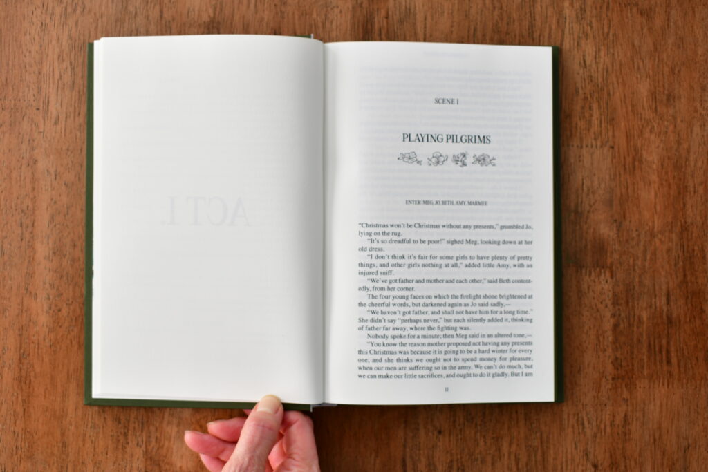 Recognizing that this book is semi-autobiographical to Alcott’s own upbringing, I incorporated that element into the design to emphasize the story’s meta nature. Jo March mirrors Alcott’s passion for writing and her sharp wit, which is reflected in the plays performed within the book. I used a playwriting structure to highlight the book’s central paradox: the tension between fiction and reality. Additionally, I referenced Greta Gerwig’s 2019 screenplay adaptation whenever green pages appear, further showcasing the story’s layered and complex nature.